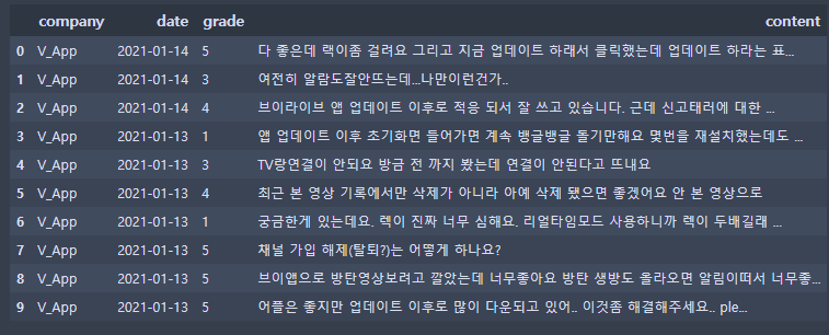 data는 작성일전으로부터 1주일 데이터를 크롤링한 데이터이다. 한번 데이터를 확인해보자.