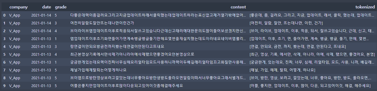 data['tokenized']=data['content'].apply(twitter.morphs) #명사마나ㅏ 토큰화