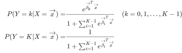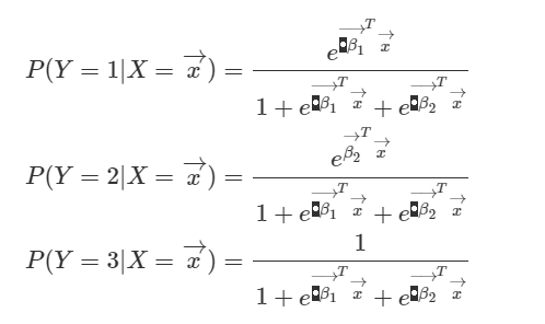 K(>=3)범주를 분류하는 다항로지스틱 회귀 모델의 입력벡터 x가 각 클래스로 분류될 확률은 다음과 같다.