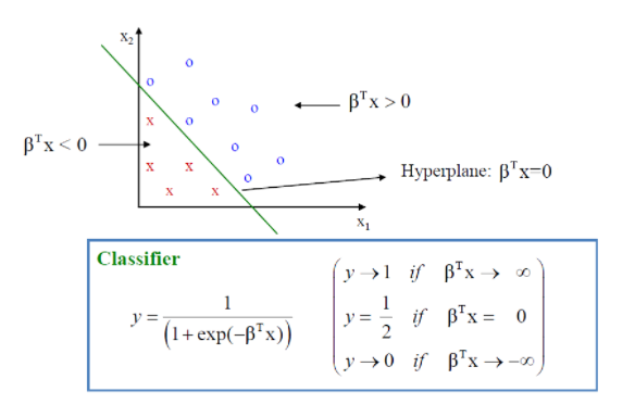 마찬가지로 βTx<0βTx<0 이면, 해당 데이터의 범주를 0으로 분류하게 된다. 따라서, 로지스틱모델의 결정경계(decision boundry)는 βTx=0βTx=0인 하이퍼플레인(hyperplane)이다.