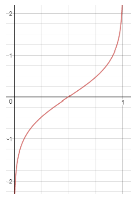 이 과정에서 로그를 취하자. 이 결과 로그 승산의 범위는 음의 무한대에서 양의 무한대가 된다. 이렇게 함으로써 양변의 범위가 일치하게 된다. 다음은 로그승산의 그래프이다.