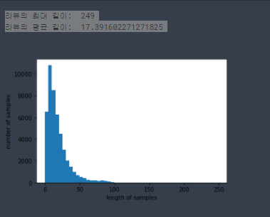 리뷰의 최대 길이는 249, 평균 길이는 17이다. 그래프를 확인해보면 대체적으로 50정도 되는 것으로 예상된다.