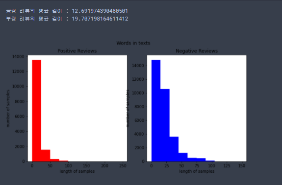 print('긍정 리뷰의 평균 길이 :', np.mean(text_len))